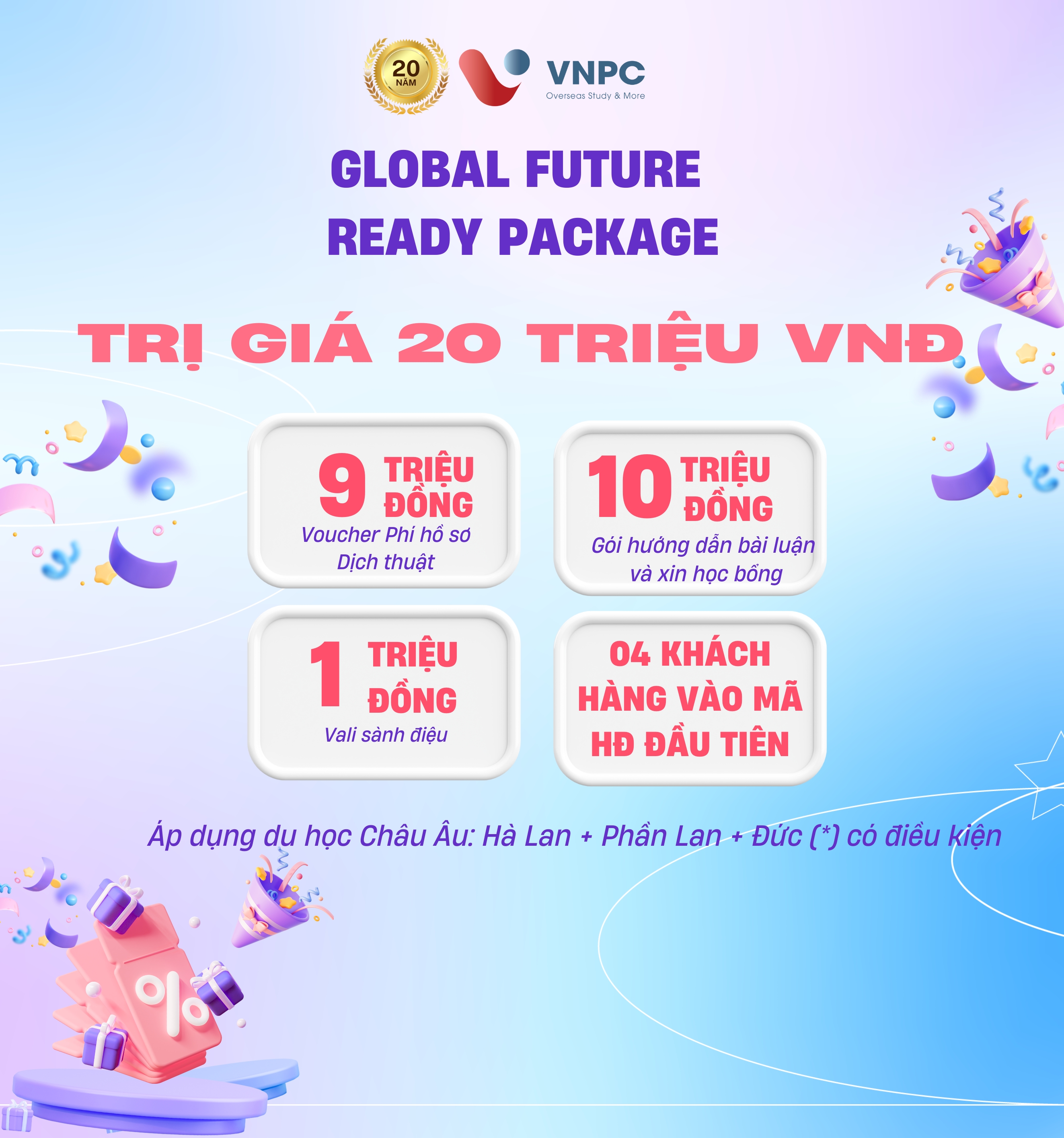 Nhân dịp kỷ niệm 20 năm thành lập, VNPC triển khai chương trình tri ân đặc biệt với 20 phần quà giá trị, được thiết kế theo từng thị trường du học nhằm hỗ trợ học sinh và phụ huynh ngay từ giai đoạn chuẩn bị ban đầu.