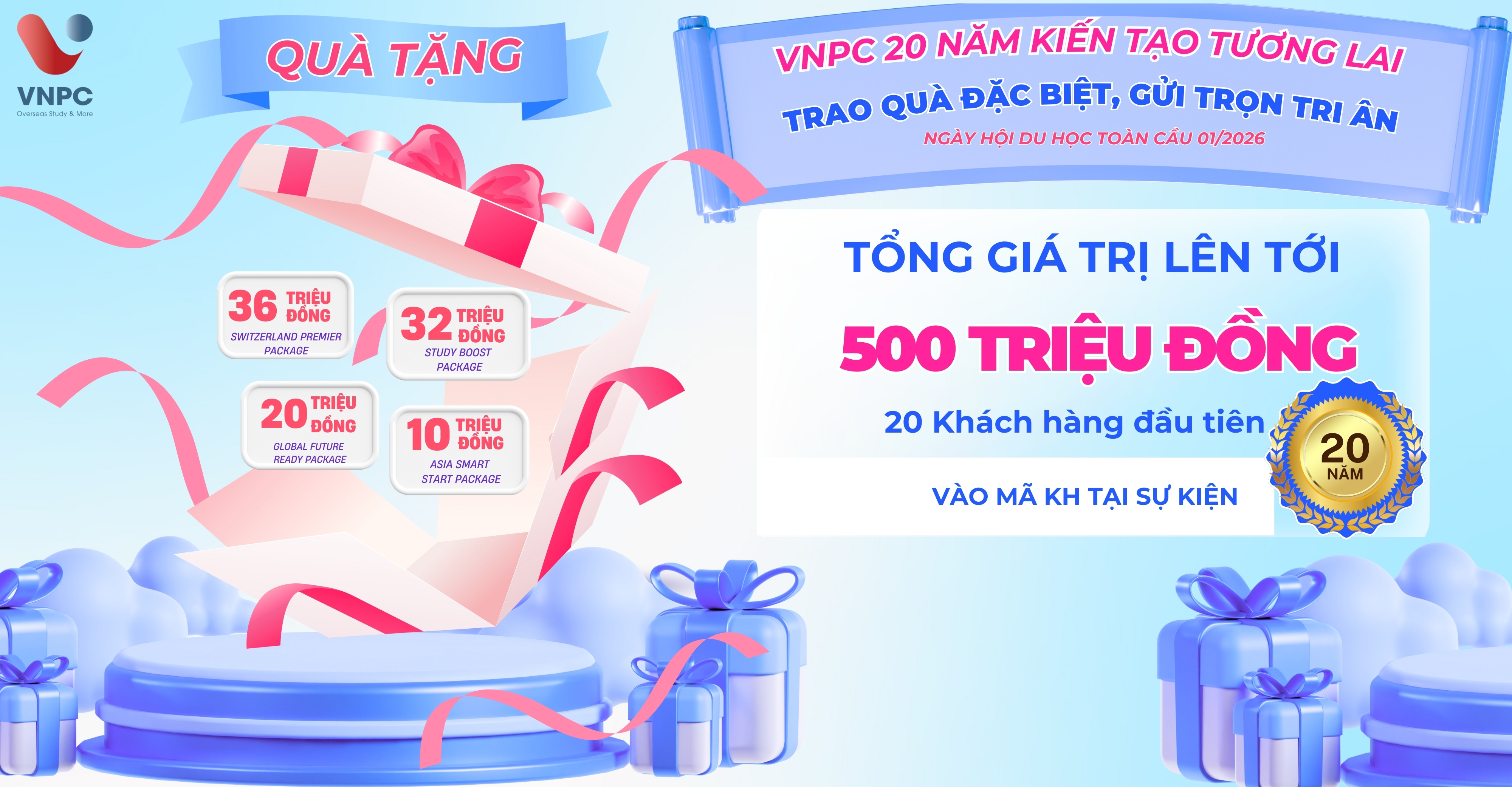 Chào đón Ngày hội Du học Toàn cầu VNPC 01/2026, VNPC triển khai chương trình quà tặng ký hợp đồng du học 2026 với tổng giá trị lên đến 500 triệu đồng. Chương trình mang đến các gói ưu đãi thiết thực như voucher vé máy bay, laptop, vali du học, phí hồ sơ, dịch thuật và hỗ trợ học bổng, giúp học sinh và phụ huynh giảm áp lực chi phí, chuẩn bị hồ sơ bài bản và tự tin bước vào hành trình du học. Đây là cơ hội đặc biệt để nhận quà giá trị và tham gia một sự kiện giàu thông tin và trải nghiệm thực tế.