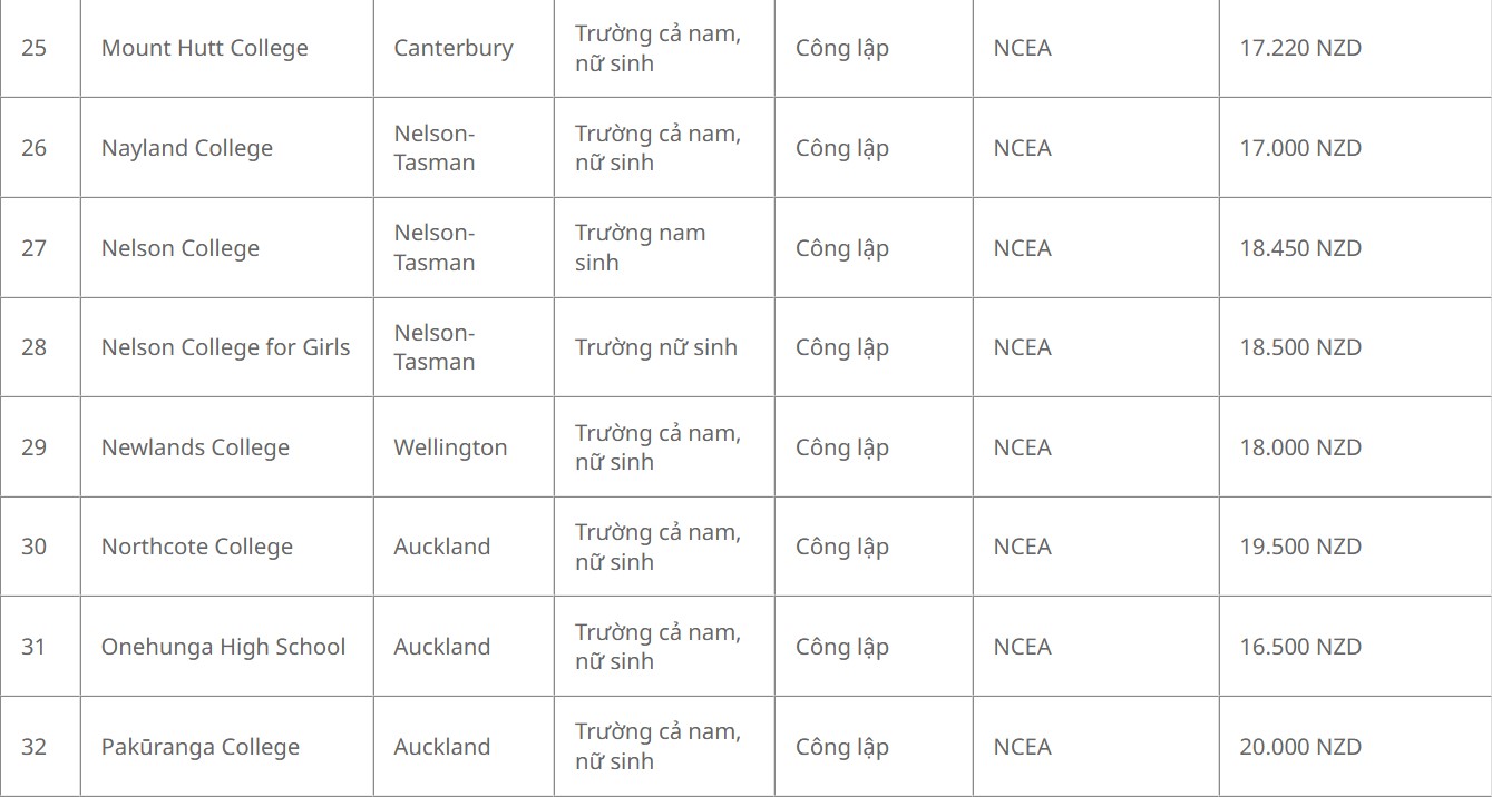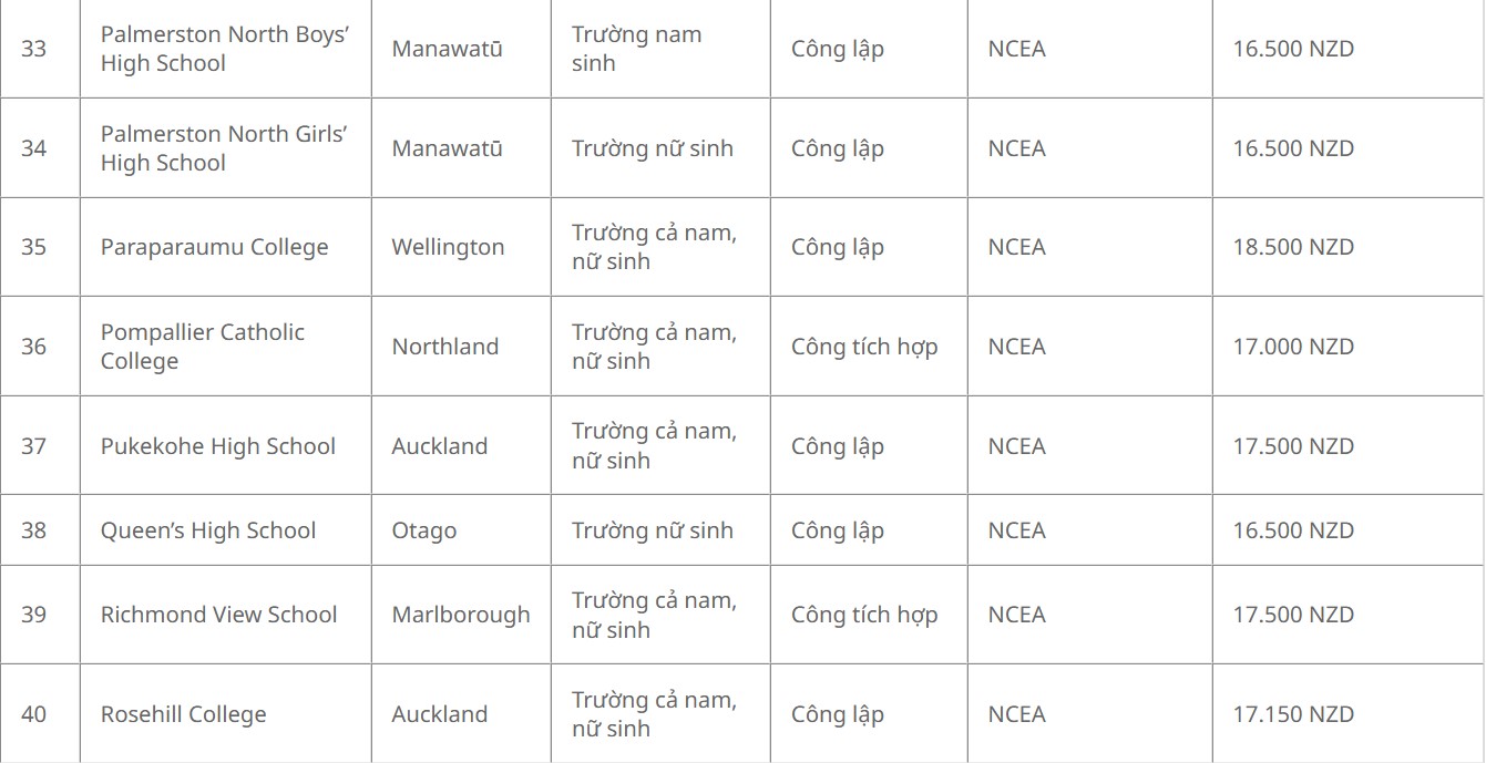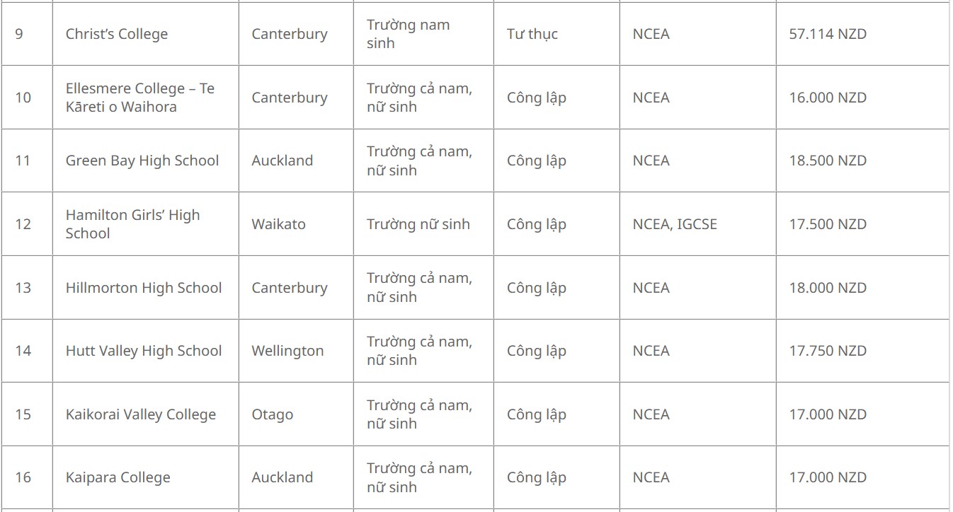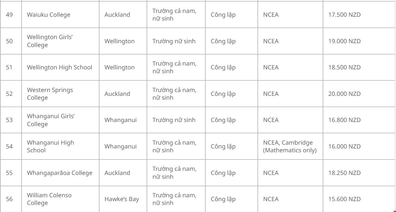 Danh sách 56 trường được nhận học bổng chỉnh phủ New Zealand bậc trung học
