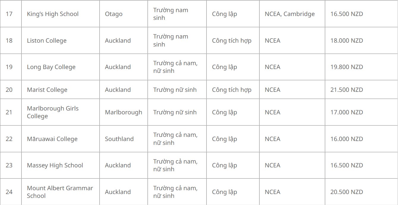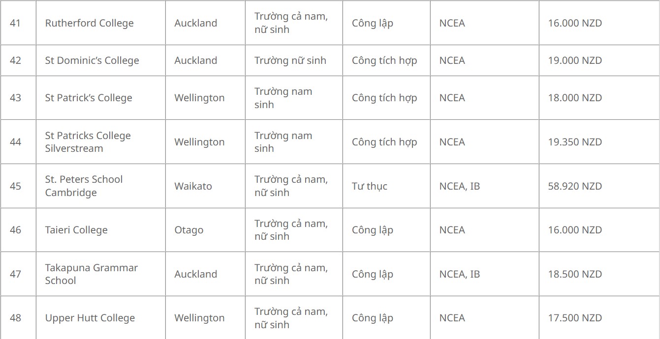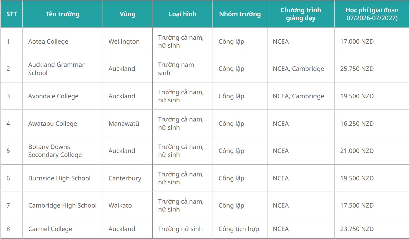 Danh sách 56 trường được nhận học bổng chỉnh phủ New Zealand bậc trung học