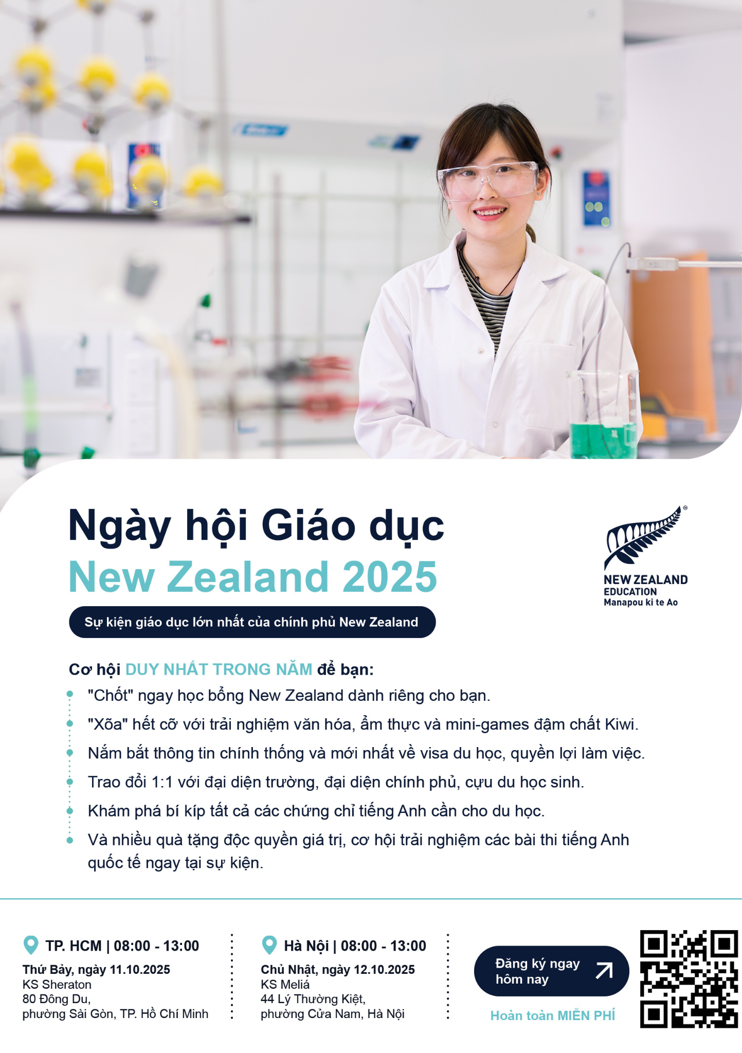 Cơ quan Giáo dục New Zealand (Education New Zealand - ENZ), phối hợp với Đại sứ quán và Tổng Lãnh sự quán New Zealand tại Việt Nam, sẽ tổ chức Ngày hội Giáo dục New Zealand 2025 vào ngày 11/10 tại TP. Hồ Chí Minh và 12/10 tại Hà Nội. Sự kiện nhằm tạo điều kiện cho phụ huynh và học sinh – sinh viên Việt Nam tìm hiểu trực tiếp về hệ thống giáo dục New Zealand, thông qua các hoạt động trải nghiệm và trao đổi chuyên sâu với đại diện đến từ các tổ chức giáo dục và cơ quan chính phủ New Zealand.
